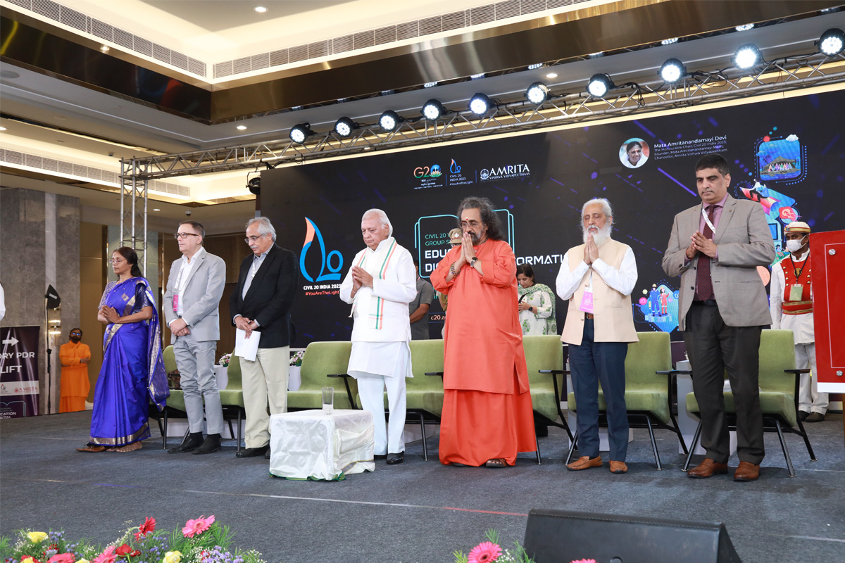 Parmi les autres personnalités présentes sur l’estrade figuraient Swami Amritaswarupananda Puri, vice-président du Mata Amritanandamayi Math et membre de la troïka du C20 ; Vijay K Nambiar, sherpa du C20 et ancien conseiller spécial du secrétaire général des Nations unies ; le professeur Anil Sahasrabudhe, président du National Educational Technology Forum (Inde) ; le professeur Venu Govindaraju, vice-président de la recherche à l’université de Buffalo (États-Unis) ; et M. Terry Durnnian, responsable de l’éducation à l’UNICEF (Inde). L’ambassadeur Gopinathan Acham, ONU, Suisse, a assisté virtuellement à l’événement.