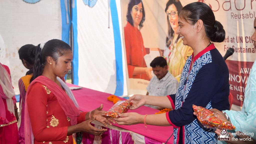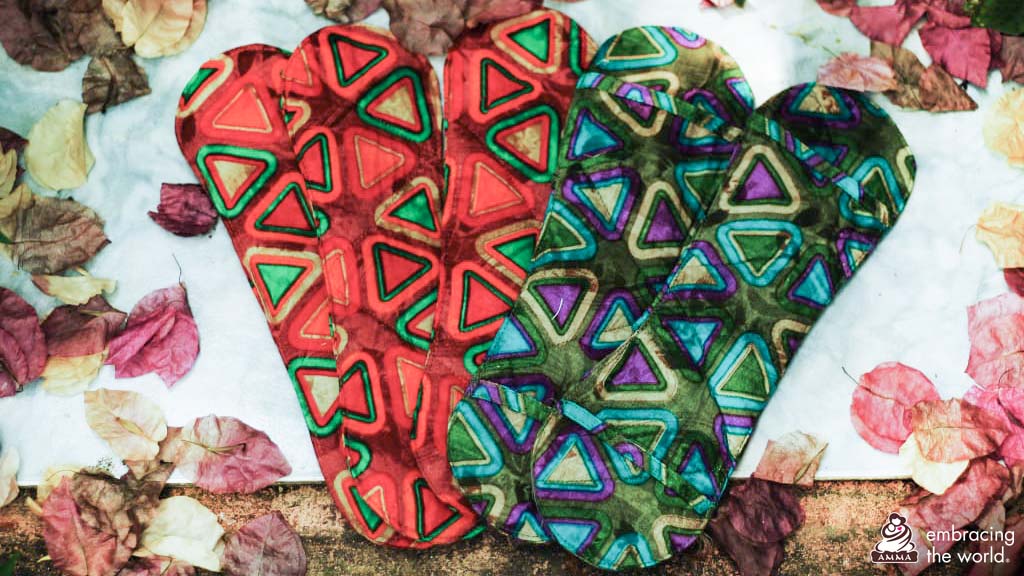 En Inde, où les femmes représentent près de la moitié des 1,38 milliard d'habitants du pays, le volume des déchets menstruels non biodégradables a de graves répercussions environnementales. La majorité du pays vivant dans des milieux de classe moyenne inférieure, le respect de pratiques d’hygiène menstruelle saines avec des produits respectueux de l'environnement passe par la durabilité, l’accessibilité financière et l'éducation. C’est pourquoi Amma a lancé le projet Saukhyam de serviettes hygiéniques réutilisables.