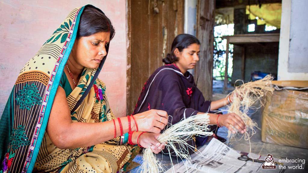 Amma souhaitait également que les serviettes Saukhyam soient fabriqués par les femmes de notre projet de villages autonomes – Amrita SeRVe – afin de diversifier leurs sources de revenus pour gagner l’argent du ménage. Aujourd’hui, il existe des centres de production au Kerala, en Uttar Pradesh, au Bihar, en Uttarakhand et au Jammu ; 46 femmes gagnent en confiance en sachant que leur travail aide d'autres femmes et notre planète.