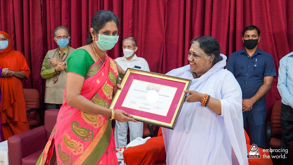 L'annonce a été faite lors d’une cérémonie à l’occasion de la toute première édition des récompenses Amrita pour l’Innovation et la Recherche. C’est Amma qui, en tant que présidente de l’université, a présidé ce prestigieux événement. Elle a souligné que l’université est axée sur une recherche fondée sur la compassion pour trouver des solutions destinées aux personnes qui sont dans le besoin, en particulier aux populations des villages indiens.