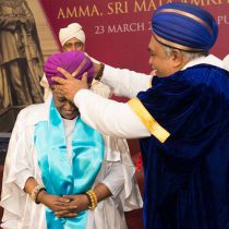 Ce diplôme honorifique a été décerné par l’université de Mysore, la sixième plus ancienne université de l’Inde, en hommage à l’œuvre sociale et humanitaire d’Amma dans le monde entier ainsi qu’à ses enseignements sur les valeurs spirituelles. Le vice-président de l’université de Mysore, le professeur G. Hemanatha Kumar a officiellement remis ce diplôme à Amma à Amritapuri.