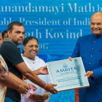 Aujourd’hui, à Amritapuri, le Président de l’Inde, Shri Ram Nath Kovind, a remis aux leaders de trois villages des certificats attestant que leurs villages respectifs sont certifiés exempts de défécation à l’air libre. Ces trois leaders habitent tous des villages adoptés par Embracing th World dans le cadre de notre programme Amrita SeRVe (village autonomes) lancé en 2013.
